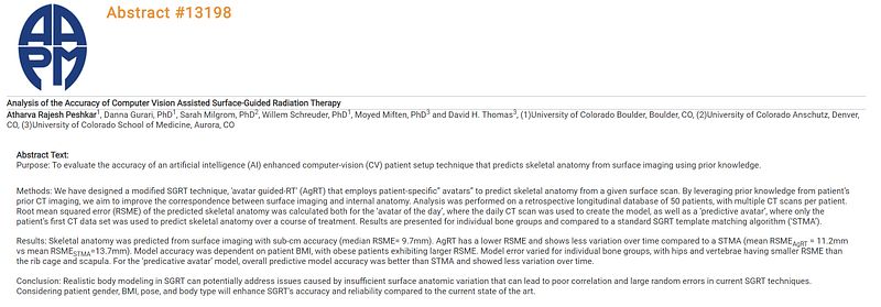 Atharva has been selected as a winner of the Science Council Session ‘Innovations in Medical Physics’ award for his work on ‘avatar guided RT’ - “This award recognizes outstanding scientific abstracts on a topic identified by the Science Council as being at the frontier of medical physics.”
