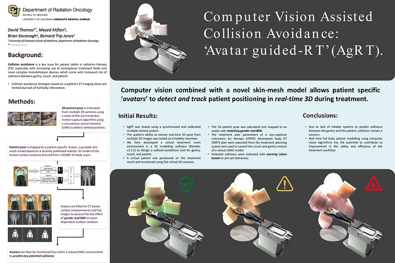 We propose ‘Avatar guided-RT’ (AgRT), a CV-assisted CA-technique. AgRT uses patient specific ‘avatars’ to detect and track patient positioning during treatment. 3D patient pose is estimated from multiple 2D cameras using a state-of-the-art markerless motion capture algorithm (J. Dong et al. 2019). Patient pose is mapped to a patient specific ‘avatar’, a posable skin mesh-model based on a recently published realistic 3D model of the human surface anatomy learned from >10,000 3D body scans (Osman, Bolkart, and Black 2020). Avatars can be fitted to CT-based surface measurements and account for the effect of gender and BMI on pose-dependent surface variation. Avatars can then be accurately monitored within a virtual LINAC environment to predict any potential collisions.