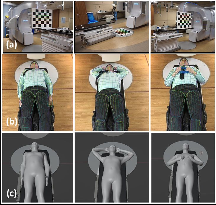 Figure 2 (a) camera system was synchronized and calibrated using a 50cmx50cm checkerboard to account for intrinsic and extrinsic camera distortions. (b) real-time 3D pose was extracted from multiple 2D images of a healthy volunteer in various treatment positions. (c) each pose was calculated and mapped to a 3D avatar with matching gender and BMI.