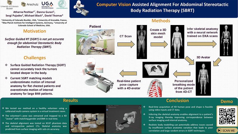 This project consists of two major innovations. Our first innovation is the use of a novel patient-specific skin mesh model to enable marker-less 3D human anatomy tracking. Our patient-specific skin mesh model is based on a recently published Sparse Trained Articulated Human Body Regressor (STAR), which is a realistic 3D model of the human body learned from >10,000 3D body scans. It allows estimation, synthesis, and analysis of 3D human pose and shape with sub-centimeter accuracy (Fig. 2). Our second innovation is an improved internal to external anatomical model that fuses patient specific body models to their internal skeletal anatomy, improving the correspondence between surface imaging and internal anatomy. We have adapted the technique outlined in Keller et al, 2022, using a neural network trained on 1000s of dual-energy X-ray absorptiometry (DXA) scans to predict the skeleton from the body surface when patients are in the treatment position (Fig. 3b-c). Accounting for patient pose and body type will be particularly valuable for overcoming two health-equity issues of current SGRT techniques,