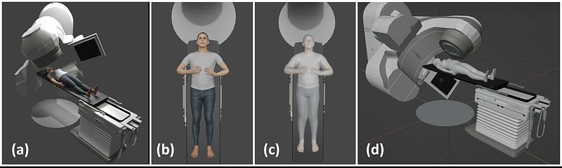 Figure 3 (a) a virtual patient positioned on the treatment couch in a virtual treatment room environment. (b) one of five virtual camera views monitoring patient pose. (c) the overlay of the 3D avatar on the 2D image in (b). (d) real time tracking of avatar, couch, and gantry motion during treatment.